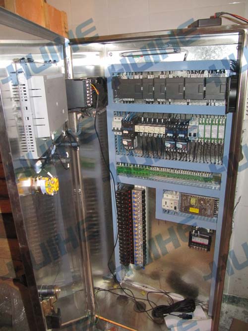 下圖為該全自動CIP清洗系統(tǒng)的控制柜內(nèi)部構(gòu)造及PLC顯示屏的運行界面。